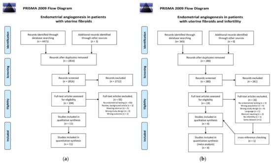 PRISMA 2009 flow diagram for the two searches that were carried out for this systematic review []. (a) Search I: Endometrial angiogenesis in patients with uterine fibroids; (b) Search II: Endometrial angiogenesis in patients with uterine fibroids and infertility.