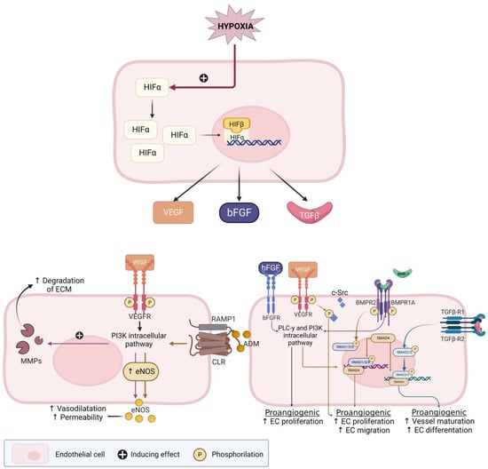 Hypoxia-inducible factor (HIF)-pathway and its effect on several pro-angiogenic factors. Adapted from a Middelkoop et al. 2023—Created with BioRender.com []. Figure legend: ↑ (upward arrow): indicates an increased process; e.g., an increased vasodilatation; ADM: adrenomedullin; bFGF: basic fibroblast growth factor; BMP(R): bone morphogenetic protein (receptor); CLR: calcitonin receptor-like receptor; c-Src: cellular Src; EC: endothelial cell; ECM: extracellular matrix; eNOS: endothelial nitric oxide synthase; FGF-R: FGF-receptor; HIFα/β: Hypoxia inducible factor; MMP: matrix metalloproteinases; NO: nitric oxide; PLC-γ: Phosphoinositide phospholipase C—pathway; PI3K: phosphoinositide 3-kinase—pathway; RAMP: receptor-activity-modifying proteins; Smad: Suppressor of mothers against decapentaplegic; TGF-β(R)1/2: transforming growth factor-β (receptor) 1 or 2; VEGF(R): vascular endothelial growth factor (receptor).