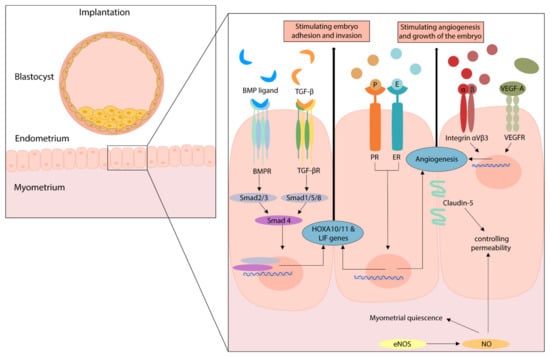 Furthermore, examples of key regulators genes of implantation are Homeobox-A10 and A11 (HOXA10/11) and leukemia inhibitory factor (LIF). If one of these genes is altered in mice, this results in infertility due to failed endometrial receptivity []. No human mutations are known in these genes, however, patients with conditions known for implantation defects such as endometriosis, hydrosalpinx, and polycystic ovary syndrome, have showed a diminished gene expression []. HOXA10 is also involved in the formation of integrin αVβ3, which was identified as a marker of the implantation window, and its localization and expression is proposed as a potential receptor for embryo adhesion []. Furthermore, integrin αVβ3 is an essential molecule that is involved in tumor angiogenesis [,]. In addition, alterations in the TGF-β or BMP/Smad pathway could lead to disturbed endometrial receptivity, since these pathways regulate HOXA10/11 and LIF expression [,]. Especially BMP-2 is critical during normal gestation, since it is shown to support implantation. Therefore, decreased levels of BMP-2 can lead to failed decidualization and the failure to support embryo implantation [].