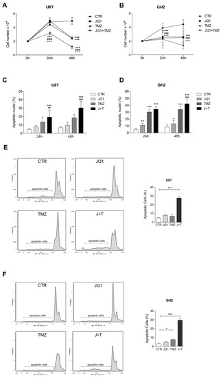 Then, we investigated the effect of JQ1 stimulation on cells treated with Temozolomide (TMZ), the first-line chemotherapeutic agent for GBM treatment. As shown in Figure 3, TMZ impaired cell proliferation beginning at 48 h of stimulation, and JQ1 co-administration significantly enhanced its anti-proliferative activity in both U87 and GH2 cells (Figure 3A and Figure 3B, respectively). Nuclear staining with DAPI and FACS analysis revealed that JQ1 itself induced a slight increase in apoptosis up to 48 h of stimulation, which was significant in GH2 cells only, and TMZ alone also induced a significant increase in apoptotic cells, as has been reported. However, the combination of JQ1 and TMZ strongly promoted apoptosis, especially beginning at 48 h of treatment in both cell lines (Figure 3C–F).