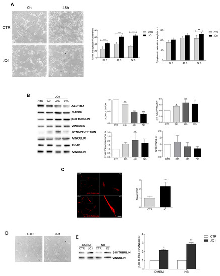 Surprisingly, the JQ1-treated U87 cells showed marked morphological changes when compared to the untreated cells. In detail, an increase in cells bearing cytoplasmic extensions and an elongation of cytoplasmic extensions was observed, beginning at 24 h, and this was more evident at 48 and 72 h (Figure 4A). The same effect was observed in the GH2 cells (Supplementary Figure S1). The increases in the number and length of cytoplasmic extensions, together with the arrest of cell proliferation, suggested the induction of a differentiation process by JQ1. To test this hypothesis, we analyzed the expression levels of the stemness marker ALDH1L1 and observed its drastic reduction after 48 h of JQ1 stimulation in both the U87 and GH2 cells (Figure 4B and Supplementary Figure S1). On the contrary, an increased expression of β3-tubulin and of synaptophysin, two markers of neuronal cells, was observed in the JQ1-treated cells (Figure 4B and Supplementary Figure S1). Notably, the analysis of the expression of the glial marker GFAP did not show any difference among the control and JQ1-treated cells (Figure 4B and Supplementary Figure S1). β3-tubulin accumulation was further confirmed by immunofluorescence experiments in both cell lines (Figure 4C and Supplementary Figure S1). To rule out the possibility of serum interference on JQ1 effects, we also performed JQ1 treatment in the presence of Neurobasal medium. Elongation of the cytoplasmic extensions and β3-tubulin accumulation were also observed in this experimental setting, as shown in Figure 4D. Altogether, these results appear to suggest that BET inhibition could stimulate cell differentiation, likely toward a neuronal-like fate, in GBM cells.