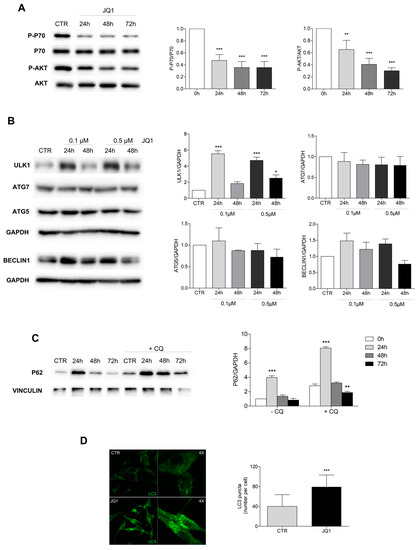 Autophagy is induced in JQ1-stimulated U87 cells. (A) U87 cells were cultured in complete DMEM (CTR) or in the presence of 0.5 μM of JQ1 for 24, 48, and 72 h, and the corresponding protein extracts were analyzed by Western blotting. The protein expression levels and activity of AKT1 and p70S6 were analyzed by using specific antibodies for the phosphorylated and total forms of both proteins. Representative images of three different experiments are shown. VINCULIN was used as a loading control. The corresponding densitometric analyses are shown in the graphs. Statistical significance: ** p < 0.01 and *** p ≤ 0.001, one-way ANOVA. (B) Western blotting analysis of the autophagy regulators ULK1, ATG7, ATG5, and BECLIN1 in the protein extracts of the U87 cells stimulated with 0.1 or 0.5 μM of JQ1 for 24 and 48 h. Representative images of three different experiments are shown. GAPDH was used as a loading control. The corresponding densitometric analyses are shown in the graphs. Statistical significance: *** p ≤ 0.001, one-way ANOVA. (C) Autophagy flux was analyzed in the cells stimulated as in (A) in the presence or absence of 20 μM of chloroquine (CQ). The expression of p62 is shown. VINCULIN was used as a loading control. The corresponding densitometric analyses are shown. Statistical significance: * p < 0.05 and ** p < 0.01, one-way ANOVA. (D) U87 cells treated with 0.5 μM of JQ1 for 48 h and untreated (CTR) cells were subjected to immunocytochemistry and confocal analysis for LC3 (green). Representative images of at least 10 fields showing the merged signals are shown. Scale bar: 30 μM. A 4× magnification is shown in the right panel. The LC3 puncta per cell were counted in 30 cells for each condition, and the corresponding graph is shown. Statistical significance: *** p ≤ 0.001, Student’s t-test.
