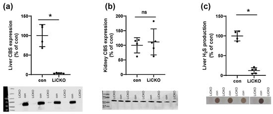Breeding of homozygous Cbsflox/flox mice with hemizygous Alb-cre mice resulted in normal litter-sizes (n = 7.6 ± 0.4) with expected mendelian distribution of genotypes, indicating that problems with perinatal mortality seen in previous models [] were not present. Western blotting for CBS in liver and kidney lysates in a subset of animals confirmed the nearly complete deletion of CBS in the liver but not in kidneys (Figure 1a,b, respectively). Moreover, H2S production was almost completely blunted in livers of LiCKO mice compared with controls (Figure 1c).