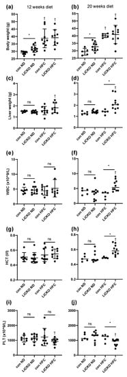 Body weight, liver weight, WBC, HCT, and PLT. (a,b) At 12 and 20 weeks of diet, body weight was higher in ND-fed LiCKO mice than controls on ND. Body weight of all groups on HFC diet were significantly increased compared with mice on ND, without differences between genotypes; (c) Liver weight of LiCKO mice on HFC diet was significantly increased over LiCKO on ND; (d) Liver weight of LiCKO mice on HFC diet was significantly increased over controls on HFC diet and over LiCKO on ND; (e) At 12 weeks of diet, no differences were observed in WBC; (f) At 20 weeks of diet, WBC in LiCKO mice on HFC diet was significantly increased over controls on HFC diet and over LiCKO on ND; (g) At 12 weeks of diet, no differences were observed in HCT; (h) At 20 weeks of diet, HCT in LiCKO mice on HFC diet was significantly increased over controls on HFC diet; (i) At 12 weeks of diet, no differences were observed in PLT; (j) At 20 weeks of diet, PLT in LiCKO mice on HFC diet was significantly decreased over controls on HFC diet and over LiCKO on ND; WBC; white blood cell count, HCT; hematocrit; PLT; platelet count; * p < 0.05 difference between con and LiCKO on same diet; † p < 0.05 difference between ND and HFC for con or LiCKO; ns = non-significant.