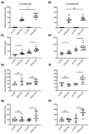 Plasma homocysteine, serum hydrogen peroxide, liver MDA staining, and plasma ALAT. (a) At 12 weeks of diet, homocysteine was elevated in plasma of ND-fed LiCKO mice and further significantly increased in LiCKO HFC mice; (b) At 20 weeks of diet, plasma homocysteine was similarly elevated in both LiCKO ND and LiCKO HFC; (c,d) At 12 and 20 weeks of diet, two-way ANOVA indicated that genotype (LiCKO) and diet (HFC) were both associated with further increased serum H2O2 concentrations; (e) No differences in liver MDA staining were observed between groups at 12 weeks of diet; (f) At 20 weeks of diet, liver MDA staining was significantly increased only in LiCKO HFC; (g,h) At 12 and 20 weeks, plasma ALAT activity was increased in LiCKO HFC over con HFC. * p < 0.05 difference between con and LiCKO on same diet; † p < 0.05 difference between ND and HFC for con or LiCKO; ns = non-significant.