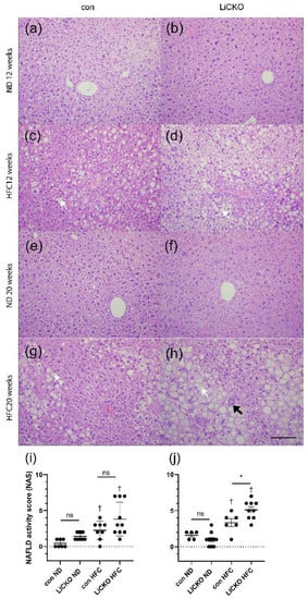 Liver histology. (a,b,e,f) No abnormal histological patterns were detected in mice on ND at 12 and 20 weeks of diet; (c) Control mice on HFC demonstrate mild steatosis (white arrow); (d) Steatosis is more aggravated in LiCKO at 12 weeks of HFC; (g) At 20 weeks of HFC, mild steatosis is present in control mice; (h) Further increased steatosis and inflammatory cells (black arrow) can be seen at 20 weeks of HFC in LiCKO; (i) NAFLD activity scores (NAS) at 12 weeks of diet; (j) NAFLD activity scores (NAS) were significantly increased in LiCKO mice at 20 weeks of HFC diet compared to controls on HFC diet. * p < 0.05 difference between con and LiCKO on same diet; † p < 0.05 difference between ND and HFC for con or LiCKO; ns = non-significant.