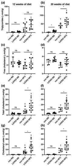 Liver triglyceride and cholesterol levels at weeks 12 and 20 of diet. (a,b) Liver triglyceride levels; (c,d) free cholesterol levels in liver; (e,f) total cholesterol and (g,h) cholesteryl levels. * p < 0.05 difference between con and LiCKO on same diet; † p < 0.05 difference between ND and HFC for con or LiCKO; ns = non-significant.