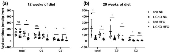 Acylcarnitines in liver. (a) Acylcarnitines at 12 weeks of diet; (b) Acylcarnitines at 20 weeks of diet; * p < 0.05 difference between con and LiCKO on same diet; † p < 0.05 difference between ND and HFC for con or LiCKO; ns = non-significant.