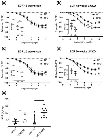 To investigate potential systemic effects of the liver-specific deletion of Cbs, we investigated vascular and renal endothelial function. Specifically, we assessed endothelium-dependent relaxation (EDR) in aortic rings and measured the albumin–creatinine ratio (ACR) in urine. For this, the thoracic descending aorta was preserved in cold saline solution, cut into rings, and mounted in a Mulvany myograph. EDR was measured in rings preconstricted with phenylephrine (PE) with subsequent stimulation by acetylcholine (Figure 7). HFC diet did not affect total EDR in control mice at 12 or 20 weeks of diet (Figure 7a,c, respectively). Interestingly, HFC diet reduced EDR in LiCKO mice at both 12 and 20 weeks compared to ND (Figure 7b,d). Quantification of the area under the curve (AUC) demonstrated a significant decrease (p < 0.05) in total EDR for HFC in LiCKO mice at week 12 (109 ± 4 vs. 176 ± 6 AUC for HFC and ND, respectively) and week 20 (127 ± 3.5 vs. 183 ± 4 AUC, for HFC and ND, respectively). ACR at 12 weeks of diet did not reveal differences between groups. Moreover, ACR (Figure 7e) was significantly increased at 20 weeks of HFC diet in LiCKO mice when compared with controls on HFC (103 ± 33 and 55 ± 37 µg/mg, respectively). Taken together, these data indicate that both the vascular and renal endothelium are affected by HFC in LiCKO.