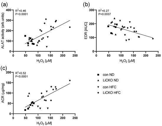 To assess whether oxidative stress correlated with the observed liver damage and endothelial damage, we constructed regression plots of ALAT activity (Figure 8a), EDR (Figure 8b), and ACR (Figure 8c) versus serum hydrogen peroxide concentrations in individual animals. ALAT and ACR correlated positively with hydrogen peroxide, indicating more liver and kidney damage with increasing hydrogen peroxide concentrations. EDR correlated negatively with serum hydrogen peroxide, indicating decreasing EDR with increasing hydrogen peroxide concentrations.