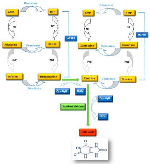 - Furuhashi, M. New insights into purine metabolism in metabolic diseases: Role of xanthine oxidoreductase activity. Am. J. Physiol. Endocrinol. Metab. 2020, 319, E827–E834. [Google Scholar] [CrossRef]