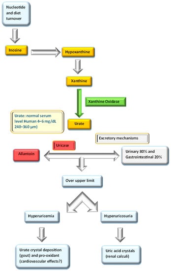- Maiuolo, J.; Oppedisano, F.; Gratteri, S.; Muscoli, C.; Mollace, V. Regulation of uric acid metabolism and excretion. Int. J. Cardiol. 2016, 213, 8–14. [Google Scholar] [CrossRef]