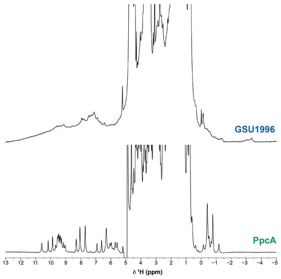 The high number of heme groups and the concomitant high molecular weight of nanowire cytochromes considerably decrease the NMR spectral quality due to signal broadness. Consequently, the necessary assignment of the heme proton signals is compromised, as it is the subsequent strategy necessary for the characterization of the proteins’ functional mechanism. To illustrate the effect of the increase in the molecular weight on the spectra quality, the 1D 1H-NMR spectra for the dodecaheme cytochrome GSU1996 (~42 kDa) and triheme cytochrome PpcA (~10 kDa) are represented in Figure 2. In fact, the considerable signal broadening observed for the signals of cytochrome GSU1996, as well as the number of heme proton signals (114, excluding the heme propionate groups) would impair their completefull and unequivocal assignment.