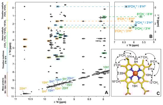 Illustration of the methodology used to assign the heme proton’s signals of domain D in the reduced state. (A) Expansion of a 2D 1H-NOESY NMR spectrum (80 ms mixing-time) region intraheme NOE connectivities for the heme meso protons. The typical regions for the heme proton signals are highlighted on the left of the spectrum; (B) Expansion of the 2D 1H-TOCSY NMR spectrum (50 ms mixing-time) highlighting the thioether methine/thioether methyls scalar coupling. The dashed lines connect the thioether methyl’s signals with the corresponding meso proton in the 2D 1H-NOESY NMR spectrum; (C) Diagram of heme c numbered according to the IUPAC-IUB nomenclature []. The full lines represent the interheme NOE connectivities. The spectra were recorded at pH 8 and 288 K on a spectrometer operating at a proton frequency of 600 MHz.
