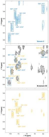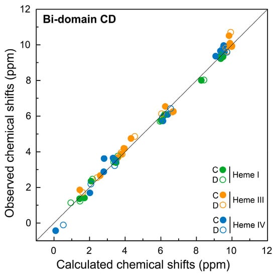 As for the individual domains, the assignment of the bi-domain’s heme signals was confirmed by comparing the observed and the predicted chemical shifts (Figure 7 and Table 2). Furthermore, in the case of the bi-domain CD, the chemical shifts correlate very well, even for the protons with large ring current shifts. The assignment was further confirmed by the analysis of the interheme NOE connectivities expected from the analysis of the crystal structure. All the expected connectivities between the closest protons were observed in the 2D 1H-NOESY spectra and contributed to the validation of the strategy used in the present work to assign the heme signals in proteins containing many heme groups.