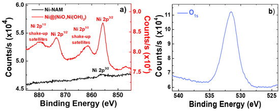In order to obtain detailed information regarding the surface chemistry of the nanowire samples before and after surface electrochemical treatment, an XPS analysis was performed. Figure 4a) shows the Ni2p core level spectra for the two different Ni NW samples. The obtained Ni2p spectrum for the as-fabricated sample (Figure 4a, in black) exhibits only a single weak peak at the energy binding of 856.1 eV, which is in good agreement with previously published XPS data for Ni [40,41]. However, the sample whose surfaces have been electrochemically treated presents two intensive peaks (Figure 4a, in red), which are ascribed to the values of Ni2p3/2 (855.6 eV) and Ni2p1/2 (873.1 eV) spectra, and two other additional peaks that correspond to their satellites appearing at the binding energies of 861.7 and 880.1 eV. All these values are in good agreement with previously published XPS data for Ni(OH)2. [40,41]. The Ni–OH bond is also detected at O1s (peak observed at 531.4 eV, in blue), as shown in Figure 4b) [40,41,42,43]. Therefore, it is clear that after the specific electrochemical process to which the former Ni NWs were submitted, a hydroxide surface layer consisting of Ni(OH)2 has been developed covering the external shell of the Ni nanowires. In addition, from HR-TEM characterization, a NiO layer is still detected, which is in good agreement with the formation of a NiO/Ni(OH)2 bilayer after the electrochemical oxidation process [32].