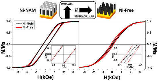 Magnetic hysteresis loops along the parallel (left) and perpendicular (right) direction of the applied magnetic field respect to NWs axis for Ni-NAM (black) and Ni-Free (red) samples. For reasons of clarity, drawings indicating sample type and direction of the applied magnetic field are also included.