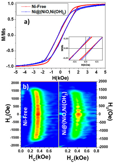 Although it has been stated before that samples show a clearly well-defined uniaxial magnetic anisotropy, the shape of parallel HLs needs further discussion and interpretation. These HLs show a tilting along the magnetic field axis by increasing the field at which the magnetization saturates while keeping their width constant. This effect is typical from a system submitted to magnetostatic interactions among particles. In order to extract the maximum information from these measurements, it is necessary to decouple the contribution from the individual nanowires and the magnetostatic interaction. It is in this aspect where FORC distributions analysis plays an important role in the current magnetic characterization of nanomaterials. When comparing the parallel HLs displayed in Figure 6a for both the Ni-Free NWs and the NWs sample that has been electrochemically oxidized (Ni@(NiO,Ni(OH)2)), it is possible to observe some differences, although very subtle ones. First, around saturation magnetization, the HL of Ni@(NiO,Ni(OH)2) sample shows more curvature closing up its branches, indicating greater contribution of reversible processes. In fact, when comparing the FORC diagrams shown in Figure 6b, the distribution along the Hu axis is diffused for the Ni@(NiO,Ni(OH)2) sample showing a more prominent distribution of non-interacting particles. This effect can also be observed in the HLs since the treated sample shows a reduction in tilting at field values near coercivity. This trend could be ascribed to the reduction in the saturation magnetization or some shielding of the magnetic straight lines due to the antiferromagnetic NiO/Ni(OH)2 shell. Paying attention at the position of the FORC distribution along the Hc axis, the mean coercive field of Ni@(NiO,Ni(OH)2) sample has increased around 17% with respect to the mean coercive field shown by Ni-Free FORC distribution. Taking these facts into account, it seems that at room temperature, the oxidation of the Ni nanowires’ surface provokes a magnetic hardening of the nanowires along the parallel direction, which could be compatible with a low anisotropic AFM layer. It is also worth mentioning the differences between the coercive field of the hysteresis loop and the one obtained with the FORC method. Nevertheless, it can be well understood as the coercivity of the HL only expresses the magnetic field value at which the net magnetization of the whole magnetic system becomes zero [44]. On the contrary, the FORC method allows extraction of a value closer to the switching field of every magnetic element (nanowire) in the system.