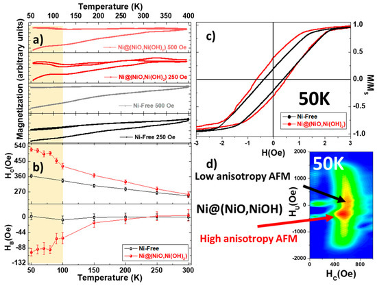 However, the best fingerprint of an AFM material considering an FM/AFM coupled system is the presence of the Exchange Bias, EB, effect. As is well known, for the EB effect to appear, it becomes necessary to orient the magnetization of both FM/AFM layers at the interface by cooling the sample below the Neel’s temperature, TN, of the AFM layer under an external applied magnetic field [12,45]. In the Figure 7a, ZFC-FC-FH curves are plotted for different values of the magnetic field applied along the parallel direction to the NWs length axis. For the Ni-Free sample, a typical magnetic behaviour corresponding to magnetic monodomain nanoparticles can be observed, with blocking temperature, TB, above room temperature [46,47]. However, once the samples are electrochemically oxidized, a new feature can be observed below 100 K. Besides the contribution of the pure Ni core, a blocking temperature coming from the AFM layer (only observed in Ni@(NiO,Ni(OH)2)-treated samples) can be seen. Although, as has already been mentioned, thr TN of bulk AFM NiO is slightly above 500 K, a reduction in this value below 100 K is commonly found in the literature with a reduction in size of the nanoparticles [20,21,22,23,24,25,26,27]. On the contrary, the TN of Ni(OH)2 is typically in the range of tenths of Kelvin [32]. Measuring the parallel HL after a cooling down with an applied magnetic field of 3T along the same direction, a shift as well as a broadening of the loops are encountered, as can be perceived in Figure 7b,c. In fact, both the shift and the coercive field increasing effects are only present at temperatures below 100 K on the Ni@(NiO,Ni(OH)2) thermomagnetic curve, bearing out the presence of an AFM shell with a blocking temperature of around 100 K.