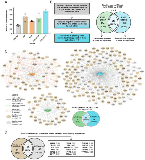 Figure 2. BioID2 candidate filtering and comparison process for final selection of Ku70 S155D-specific interactors: (A) total number of proteins identified in three biological replicates of BioID2 in Flp-InTM T-REx 293 stable cell lines: parental T-REx 293, NLS (Ku70)-BioID2, Ku70 WT-BioID2, Ku70 S155A-BioID2, and Ku70 S155D-BioID2; (B) flow chart of the filtering process used to select final candidates prioritizing number of replicates. Venn diagram compares negative control-filtered Ku70 S155A- and S155D-BioID2 proteins appearing in one or more (n ≥ 1) MS replicates before focusing on those exclusive to Ku70 S155D that appeared in three biological replicates; (C) quantitative SAINTexpress analysis to determine high confidence interactors for wild-type Ku70, Ku70 S155A, and Ku70 S155D before comparing Ku70 S155A and S155D candidates with a SAINTexpress score of ≥ 0.6 and focusing on those exclusive to Ku70 S155D; (D) final seventeen Ku70 S155D-specific candidates determined combining both qualitative and quantitative filtering approaches with a SAINTexpress score indicated beside each candidate.