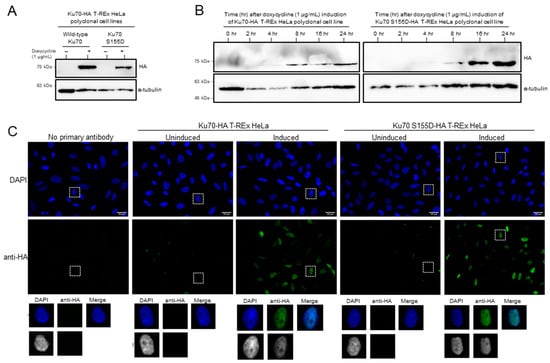 Figure 3. Generating doxycycline-inducible wild-type Ku70-HA and Ku70 S155D-HA Flp-InTM T-REx HeLa stable cell lines. All Western blots depicted show 50 μg of whole cell extracts (WCE), with or without doxycycline (1 μg/mL). Western blots were probed with HA and α-tubulin antibodies: (A) Western blot of inducible stable cell lines with and without 24 h of doxycycline; (B) time course experiment showing the inducible expression of both polyclonal stable cell lines induced with doxycycline over a period of 24 h; (C) cell lines induced with or without doxycycline for 24 h before analysis by indirect immunofluorescence using HA antibody, imaged at 647 nm wavelength. Images were taken at 40× magnification with the white line representing 20 μm. Representative images are shown with cropped enlargements of individual cells colored (top) or grey-scaled (below).