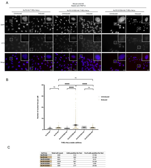 Figure 4. PLA analysis with wild-type Ku70-HA, Ku70 S155D-HA, and Ku70 S155A-HA T-REx HeLa stable cell lines and candidate protein TRIP12: (A) wild-type Ku70-HA, Ku70 S155D-HA, and Ku70 S155A-HA stable cell lines were induced with doxycycline (1 μg/mL) for 24 h prior to seeding and fixing cells, then PLA was conducted using mouse MINUS and rabbit PLUS probes to determine if there was an association between Ku70 S155D-HA and the Ku70 S155D-specific BioID2 candidate protein TRIP12. Images were taken at 40× magnification with the white line representing 20 μm. Insets show enlargements of individual cells; (B) PLA quantification using ImageJ. Average number of nuclear foci determined for a minimum of 600 cells from 1–2 technical replicates (different cell passages) from four separate PLA experiments (biological replicates); only cells positive for foci are plotted. The bars represent the mean with 95% confidence intervals indicated. The “ns” stands for not significant, while **** indicates a p-value less than 0.0001; (C) proportion of cells positive for foci per cell line. The number of cells counted from four separate biological replicates is shown with the number and proportion of cells positive for foci.