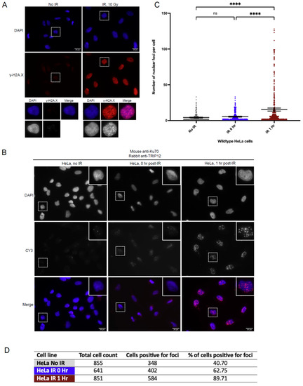 Figure 5. PLA with endogenous Ku70 and TRIP12 in HeLa cells treated with IR to produce DSBs: (A) indirect immunofluorescence testing HeLa cells treated with 10 Gy IR for the presence of DSBs using a specific antibody to detect γ-H2AX. Images were taken at 40× magnification. Below, cropped enlargements of individual cells are shown either colored or in grey-scale; (B) representative images of PLA conducted with endogenous Ku70 and TRIP12 in HeLa cells without IR (no IR), with 10 Gy IR and fixed immediately (IR 0 h), or with cells fixed 1 h post-10 Gy IR (IR 1 h), visualized with immunofluorescence microscopy. Images were taken at 40× magnification with the white line representing 20 μm. Insets show enlargements of individual cells; (C) PLA quantification of the number of nuclear foci per cell was determined using ImageJ. The average number of nuclear foci are depicted as bar graphs and calculated for a minimum total of 600 cells for each condition from four technical replicates for each of three separate experiments or biological replicates; only cells positive for foci are plotted. The bars represent the mean with 95% confidence intervals indicated. The “ns” stands for not significant, while **** indicates a p-value less than 0.0001; (D) proportion of cells positive for foci. The number of cells counted from three separate biological replicates is shown with the number and the proportion of cells per treatment that were positive for foci.