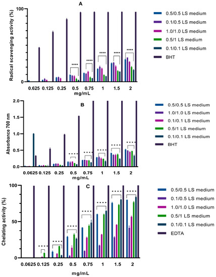 Free radical scavenging activity (DPPH assay) (A), reducing power (B), and ferrous ion chelating activity (C) of methanol extracts obtained from biomass of R. montana bioreactor cultures 2 grown on LS medium variant supplemented with different concentrations of NAA/BAP mg/L 293 (0.5/0.5, 0.1/0.5, 1.0/1.0, 0.1/0.1), after 5-week growth cycle. Reference standard: BHT (A,B), EDTA (C). Values are expressed as the mean ± SD (n = 3). Statistically significant differences between different variant are indicated as **** p < 0.0001.