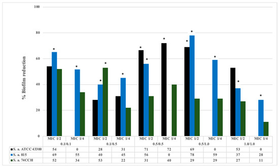 The R. montana extracts demonstrated a good capacity to reduce biofilm formation of methicillin-resistant S. aureus (MRSA) strains and biofilm producers (Figure 3). Compared to the demonstration on S. aureus 74CCH (53–27%) at 1/2 MIC, there was a higher activity on S. aureus 815 with a biofilm biomass reduction range from 78 to 37% and on S. aureus ATCC 43,300 with reduction from 71 to 28%. The extract 0.5./1.0 LS medium, particularly, reduced the biofilm formation of S. aureus 815 (78%) and S. aureus 43,300 (69%) followed by the 0.5/05 LS medium on S. aureus 43,300 (71%) and the 0.1/0.1 LS medium on S. aureus 815 (69%). The extract of the 0.5/0.5 LS medium showed a high activity against S. aureus ATCC 43,300 with a reduction in biofilm formation of 72% at 1/4 MIC. According to a study by Lemos et al. (2016), the action of the extracts was classified as highly effective in the range from ≤60% to ≤90% of the biofilm reduction. Statistically significant differences are indicated as * p < 0.05 vs. each control group [47]. The activity of extracts on strong biofilm producer strains is interesting. LS 0.5/1.0, followed by the LS 0.5/0.5 and 0.1/0.1 LS media variants among all the extracts, showed the best activity. Coumarins and alkaloids can interfere in biofilm production by repressing curli genes and motility genes, while catechins disrupt glycocalyx [48,49,50].
