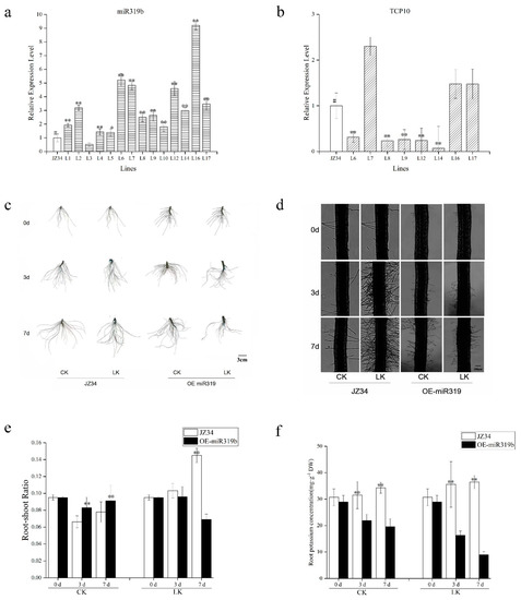 To investigate the contribution of SlmiR319b to the response to low-K+ stress, we created 14 lines of SlmiR319b overexpression. We introduced the OE-miR319 construct into the JZ34 tomato cultivation. For JZ34, we further improved the genetic transformation method of tomato. Finally, after PCR screening and measurement of SlmiR319b expression levels, eight lines (L6, L7, L8, L9, L12, L14, L16, L17) showed a significant increase in SlmiR319b expression (Figure 2a). We also examined the target SlTCP10 expression levels among the eight lines (Figure 2b). In the L6, L8, L9, L12 and L14 OE-miR319 plants, target SlTCP10 showed the opposite tendency to SlmiR319 expression levels. Therefore, these five lines were selected to save the next generation of seeds.