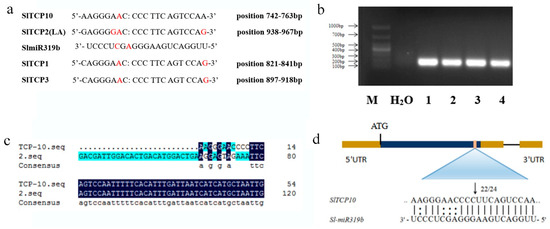 SlTCP2 (Lanceolate) is cleaved at nucleotides 10 and 11 of the miR319 recognition site [27]. According to our results, the transcription factors Solyc07g053410.2, Solyc02g077250.2 and Solyc12g014140.1 (SlTCP10, SlTCP1 and SlTCP3, respectively) (Tomato Sol Genomic Network database, http://solgenomics.net/, accessed on 3 April 2023) were predicted to serve as targets for SlmiR319b using complementary sequence analysis (Figure 3a). To confirm that these three TCPs were subjected to miRNA-mediated cleavage in vivo, we isolated mRNAs from tomato leaves and performed 5′-RACE to detect their 5′ cleavage products. A single 5′-RACE product of the size predicted to be generated from the cleaved SlTCP10 template could be amplified, and the products from 5′RNA ligase-mediated RACE corresponded to the miRNA cleavage between nucleotides 10 and 11 of the miR319 recognition site in SlTCP10 transcripts (Figure 3b–d). However, the 5′-RACE products of the size predicted to be generated from the cleaved SlTCP1 and SlTCP3 template could not be amplified.