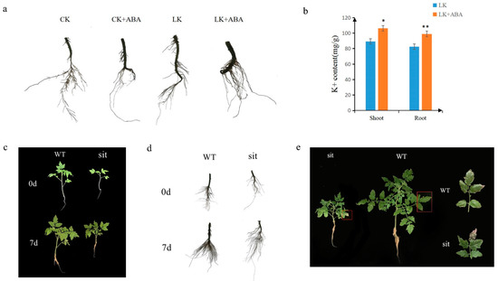 The influence on the tolerance of tomato to low potassium by the ABA treatment: (a) the root phenotype of under the normal condition (CK) and low potassium (LK) with ABA treatment 7 d; (b) the content of shoot and root under the normal condition (CK) and low potassium (LK) with ABA treatment for 7 d. The plant and root phenotype, root hair of sit mutants with low-potassium treatment for 7 days. WT represents the wild-type; (c,d) the sit mutants and WT with treatment of low potassium for 7 d; (d) the root phenotype of sit mutants and WT under the normal condition and low potassium (LK) treatment; (e) the plant phenotype of sit mutants and WT after low-potassium treatment for 21 d. Asterisks indicate significant difference as determined using one-way ANOVA (*, p < 0.05; **, p < 0.01).