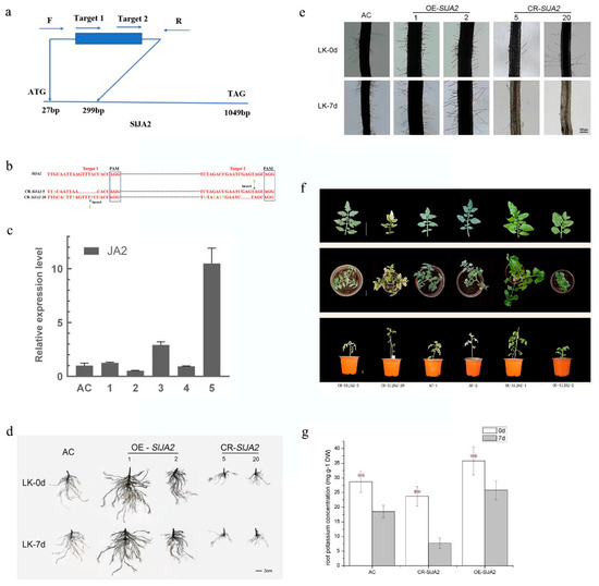 SlJA2 appears to be the major factor regulated by TCP10. Therefore, SlJA2 plays a key role in the miR319 regulatory network of response to low-K+ stress in tomato plants. We further evaluated the role of SlJA2 in response to low-K+ stress by knocking down and overexpressing it. We used CRISPR-Cas9 to generate transgenic tomato lines (CR-SlJA2) (Figure 6a). We observed four single-base mutations, one double-base mutation, one single-base insertion and one three-base deletion in CR-SlJA2-20 by sequencing the positive plants (Figure 6b). We found one single-base mutation, one single-base insertion and a six-base deletion in CR-SlJA2-5 by sequencing the positive plants (Figure 6b). Simultaneously, the pBWA(V)HS-SlJA2 overexpression vector was constructed. Expression levels in the overexpressing plants were detected using SlJA2 RT-PCR (Figure 6c). We observed that the root development of the OE-SlJA2 and CR-SlJA2 lines exhibited greatly contrasting states under control conditions (LK-0d) (Figure 6d). The OE-SlJA2 plants had a larger root system than the CR-SlJA2 plants. After 7 d of low-K+ treatment, the OE-SlJA2 lines still had more roots compared with the control; conversely, the CR-SlJA2 lines showed fewer roots than the control. The OE-SlJA2 plants had longer and more root hair after low-K+ treatment at 7 d than at 0 d (Figure 6e). By contrast, the CR-SlJA2 plants had nearly no root hair after 7 d low-K+ treatment. Statistical analysis revealed that OE-SlJA2 had significantly more root hairs than CR-SlJA2 (Table 3). After low-K+ treatment for 7 d, the number of root hairs in CR-SlJA2 and OE-SlJA2 both declined, with CR-SlJA2 showing a greater decline rate. The root length, volume and surface area data revealed that low-K+ stress expanded the root system of the OE-SlJA2 lines but contracted that of the CR-SlJA2 lines (Table 4). After 7 d low-K+ treatment, yellow leaves quickly appeared in the CR-SlJA2 lines, but the OE-SlJA2 and WT (AC) lines did not exhibit this typical K+ deficiency phenotype (Figure 6f). The root K+ contents of CR-SlJA2 and AC were all decreased after 7 d low-K+ treatment compared with the normal condition (Figure 6g). However, the degree of reduction of the CR-SlJA2 plants was greater. The root K+ content of OE-SlJA2 with low-K+ treatment was nearly the same as in the control. In general, SlJA2 enhanced tomato plant resistance to low-K+ stress and root system adaptation which was evidenced by the root growth and root hair development.