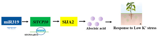 K+ is primarily absorbed by the plant roots. We previously reported that the low-K+-tolerant JZ34 and low-K+-sensitive JZ18 tomato genotypes display different root configurations under K+ deficiency stress [27]. Therefore, it is necessary to study the molecular regulation mechanism of the tolerance of JZ34 to low-K+ stress. This tolerance to low-K+ stress might be due to changes in the root growth signaling pathway, which in turn influences K+ absorption under K+ deficiency conditions. Notably, SlmiR319b expression levels in JZ34 are significantly lower than those in JZ18 during the early stage of low-K+ treatment. The discovery of how the target gene TCP10 mediates the downstream pathway regulated by SlmiR319b provides new insight into the function of this important regulatory network.