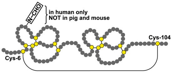 Mammalian TFF2 contains two cysteine-rich TFF domains, and the N- and C-terminal regions are connected with an additional disulfide bridge between Cys-6 and Cys-104, generating a circular structure (Figure 1; reviews: [2,28]). Human TFF2 is N-glycosylated, containing in its gastric form an unusual fucosylated N,N’-diacetyllactosediamine (LacdiNAc) oligosaccharide [29], whereas the porcine and murine homologous polypeptides are not N-glycosylated (Figure 1). The extent of N-glycosylation, as well as the concentration of TFF2 in the human gastric juice, shows dramatic diurnal variations [30]. There is also an ortholog of TFF2, termed xP4, in the frog Xenopus laevis, which contains four TFF domains arranged in tandem [31,32]. Furthermore, a peptide with astonishing structural similarity to TFF2 exists in X. laevis skin, also consisting of two TFF domains [33].