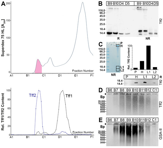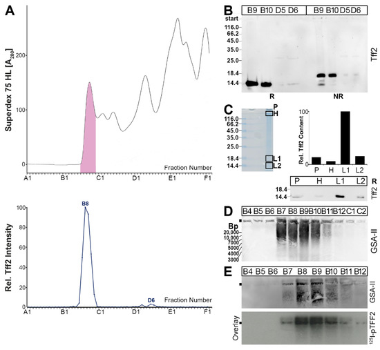 Analysis of a murine gastric extract (5 animals). (A) Elution profile after SEC (Superdex 75 HL) as determined by absorbance at 280 nm (PAS-positive mucin fractions: pink). Underneath: Distribution of the relative Tff1 (black) and Tff2 contents (blue) as determined by Western blot analysis under reducing conditions and semi-quantitative analysis of the monomeric band intensities. (B) 15% SDS-PAGE under reducing (R) and non-reducing (NR) conditions, respectively, and Western blot analysis of the high-molecular-mass fractions B9 and B10, as well as the low-molecular-mass fractions D4 and D5 concerning Tff2. (C) Non-reducing 15% SDS-PAGE of fraction B10 and Coomassie staining. The high- (H) and low-molecular-mass regions (L1, L2) were excised, proteins eluted, and subjected to reducing SDS-PAGE. The samples not entering the gel were removed from the gel pocket (P) and subjected to reducing SDS-PAGE. Western blot analysis concerning Tff2 of P, H, L1, and L2 and relative Tff2 content. (D,E) 1% AgGE and Western blot analysis of fractions B6–C1 concerning Tff2 (D) or Muc6 (lectin GSA-II, (E)). Relative standard: DNA ladder (base pairs).