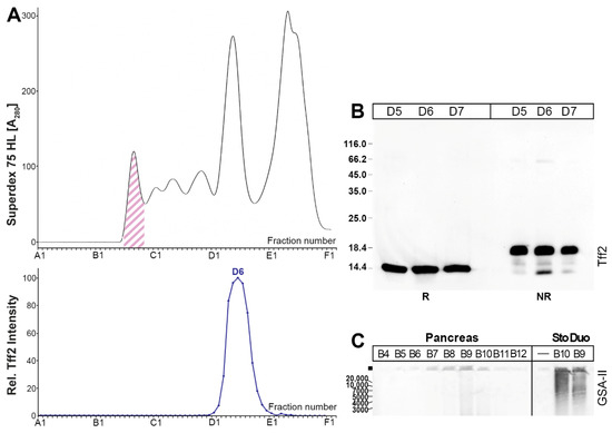 Analysis of a murine pancreatic extract (3 animals). (A) Elution profile after SEC on a Superdex 75 HL column as determined by absorbance at 280 nm (faint PAS-positive mucin fractions: pink-hashed). Underneath: Distribution of the relative Tff2 content as determined by Western blot analysis under reducing conditions and semi-quantitative analysis of the monomeric band intensities. (B) 15% SDS-PAGE under reducing (R) and non-reducing (NR) conditions, respectively, and Western blot analysis of the low-molecular-mass fractions D5–D7 concerning Tff2. (C) 1% AgGE and Western blot analysis of high-molecular-mass fractions B4–B12 concerning Muc6 (lectin GSA-II). As positive controls, equivalent samples from the stomach (Sto) and duodenum (Duo), respectively, were analyzed. Relative standard: DNA ladder (base pairs).