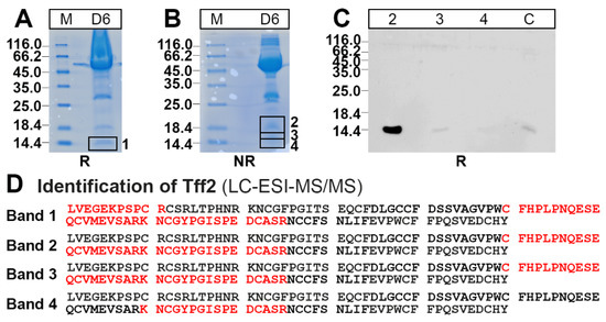Proteome analysis of the low-molecular-mass form of Tff2 in a pancreatic extract (fraction D6 from Figure 3). (A) SDS-PAGE under reducing (R) conditions and Coomassie staining. Band 1 was excised. (B) NR SDS-PAGE and Coomassie staining. Bands 2, 3, and 4 were excised, proteins eluted, and subjected to reducing SDS-PAGE. (C) Western blot analysis concerning Tff2 (bands 2–4; C positive control). (D) Results of the proteome analyses after tryptic in-gel digestion of bands 1–4. Identified regions in Tff2 are shown in red.