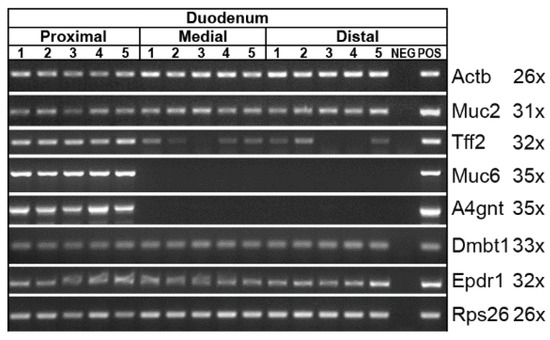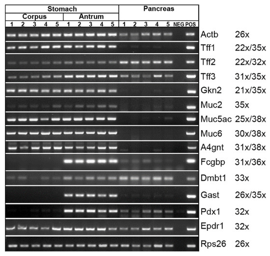 The specific primer pairs used for the RT-PCR have been published previously (Actb, MB2658/MB2659; Epdr1 MB1890/1891; Gast MB2450/MB2451; Muc2 MB2660/MB2661; Pdx1 MB2464/MB2465; Tff1 MD7/MD8; and Tff2 MB2306/2307) [66,83,84,85] and are listed in Table 1 (A4gnt, Dmbt1, Fcgbp, Gkn2, Muc5ac, Muc6, Rps26, and Tff3). All the primer pairs used are intron spanning.