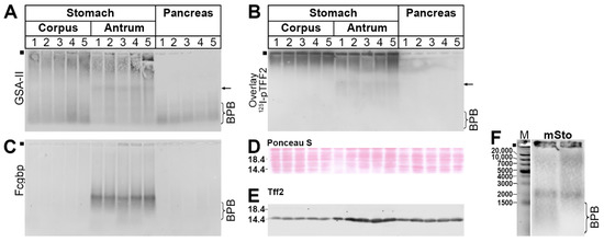 The murine Tff1 and Tff2 were detected with the affinity-purified polyclonal antisera anti-mTff1-1 [81], anti-TFF2 (PA5-75670; Invitrogen by Thermo Fisher Scientific Baltics UAB, Vilnius, Lithuania), and anti-hTFF2-2 [62] (Figure 9E), respectively. The mucins Muc6 and Muc5ac were detected with the biotinylated lectins GSA-II from G. simplicifolia or WFA from Wisteria floribunda, respectively, as reported [42,61,63]. The Fcgbp was detected with a polyclonal antiserum against a fragment of rat Fcgbp kindly provided by Prof. Jürgen Seitz (Philipps University, Marburg, Germany) [82].