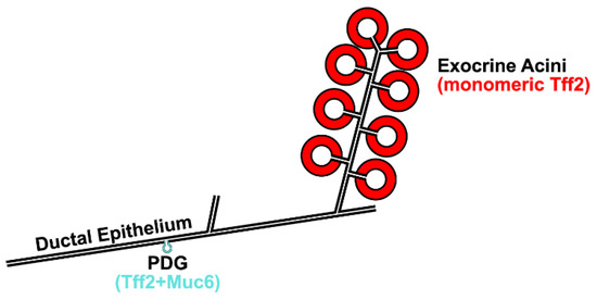 The pancreatic ductal epithelium, but not the terminal ducts, undergoes continuous self-renewal from stem and precursor cells located in the PDGs (Figure 10) [21]. Here, only trace amounts of Tff2 and Muc6 are secreted (Figure 10) [21,72], which might protect the content of the PDGs by a mucus plug (probably the formation of a Tff2/Muc6 complex). However, such trace amounts of a presumable Tff2/Muc6 complex were not detected with the methods used (Figure 3). Of special note, the migration of cells from the PDGs to populate the ductal epithelium is dependent on Tff2 [21].