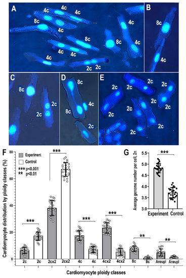 Cardiomyocyte ploidy was evaluated after staining of cell smears with 20 µg/mL Hoechst 33258 water solutions for 15 min. For this purpose, 3–5 drops of the staining solution were dipped on the smears and covered with cover slips. The quantitative image analysis was conducted with a Zeiss Axioskop microscope equipped with a digital CCD video camera VarioCam (PCO Computer Optics GMBH, PCO-Tech, Kelheim, Germany), using Image J program package. At least 500 cardiomyocytes were evaluated for 24 experimental and 24 control rats. Cardiomyocyte ploidy levels were determined using splenocytes of the same animals as reference cells with diploid DNA quantity. The proportion of cardiomyocytes in S-phase did not exceed 1.5% in postnatal rats [165]. Therefore, in order to distinguish the S-phase cells from the polyploid ones, we excluded cells with ploidy not divisible by 2n (±10%). Average cardiomyocyte genome number was calculated by the formula taken form [14,150].