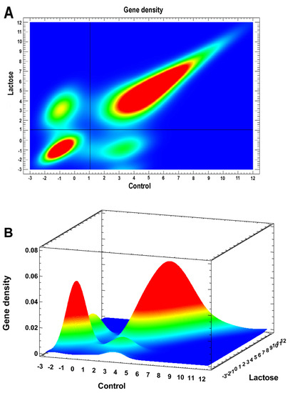 Two dimensional histograms of gene expression levels in the experiment (NLI) vs. the control. (A)—2D representation. The four peaks of gene expression density are visible: the lower left (no expression both in experiment and the control), the upper left (expression only in the experiment, i.e., switched on), the lower right (expression only in the control, i.e., switched off), and the upper right (expression both in experiment and the control). The cutoff values are shown by the horizontal and vertical black lines. The genes from the upper left (switched on) and the lower right (switched off) rectangles were analyzed. The significance of pairwise differences between any peaks are p < 10−24 at least (both Mann–Whitney and t-test). (B)—3D representation (the color scale of gene density is seen).