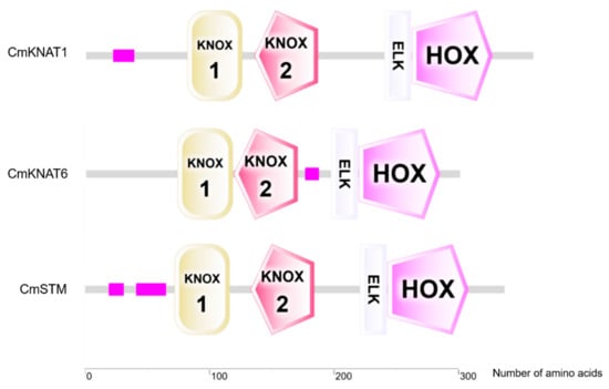 KNOX genes belong to the KNOX gene family, and their encoded proteins contain four domains, namely the KNOX1 domain, KNOX2 domain, ELK domain, and Homeobox_ KN domain [,]. Homeobox_ KN domain has one more ring structure than the conventional homeodomain, which is a characteristic of the TALE gene family []. Therefore, KNOX genes belong to the TALE branch of the Homeobox gene family. Homeobox_ KN domain can bind the promoter sequence of the downstream gene, and the lk domain encodes the nuclear localization sequence, which may be involved in the regulation of transcriptional inhibition []. In addition, the KNOX gene family can be divided into three branches, namely class I KNOX, class II KNOX, and class III KNOX. Among them, the expression pattern of genes belonging to the class I KNOX branch is tissue-specific and may play a key role in the regulation of cell meristematic ability []. In this study, we cloned and bioinformatics analyzed the three KNOX genes that may be involved in the regulation of chrysanthemum axillary bud formation. The results showed that these three KNOX genes all contain the characteristic domain of the KNOX gene family, all belong to the class I KNOX branch, and all can enter the nucleus, so they may also be involved in the regulation of cell meristematic ability as transcription factors.