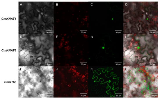 Subcellular localization of these three chrysanthemum KNOX genes in Nicotiana benthamiana leaves ((A,E,I) show the cells under bright field; (B,F,J) show the spontaneous red light of chloroplasts; (C,G,K) show the green fluorescence of GFP protein; (D,H,L) show the superposition of bright field and fluorescence).