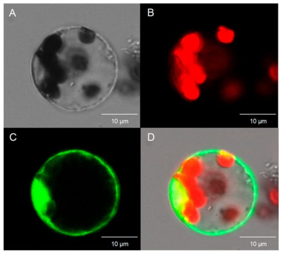 Subcellular localization of chrysanthemum CmSTM gene in chrysanthemum protoplast ((A) shows the cells under bright field, (B) shows the spontaneous red light of chloroplasts, (C) shows the green fluorescence of GFP protein, and (D) shows the superposition of bright field and fluorescence).