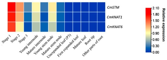 The expression levels of CmKNAT1, CmKNAT6, and CmSTM genes in the different development stages of chrysanthemum axillary bud formation and different tissues were analyzed by fluorescence quantitative PCR. The results showed that the overall situation of the expression profiles of these three chrysanthemum KNOX genes was consistent. During the formation of axillary buds, the expression level of these three chrysanthemum KNOX genes was continuously down-regulated, that is, the expression level in Stage 1 was high, the expression level in Stage 2 was down-regulated, and the expression level in Stage 3 was further down-regulated. Among them, Stage 1 is the AM formation stage of the chrysanthemum axillary bud and Stage 2 is the leaf primordium formation stage of the chrysanthemum axillary bud. Stage 3 is in the development completion state of the chrysanthemum axillary bud, and at this time, the leaf primordium significantly elongates, tightly wrapping AM. Therefore, these three chrysanthemum KNOX genes may participate in the regulation of AM formation of axillary buds (Figure 6).