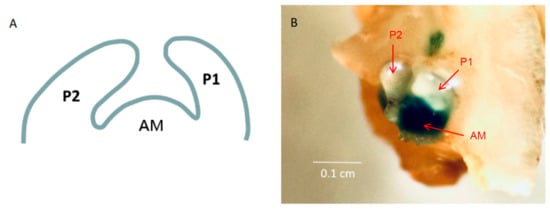 GUS staining results of CmSTM gene promoter of chrysanthemum ((A) is the schematic diagram of axillary bud structure, and (B) is the GUS staining results of an axillary bud of transgenic tobacco; P1 represents the first leaf primordium, P2 represents the second leaf primordium, and AM represents the axillary meristem).