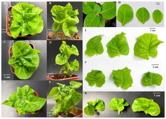 Phenotype observation of tobacco plant overexpressing chrysanthemum KNOX gene ((A,B,I) show the top view, front view, and leaves of tobacco plants overexpressing chrysanthemum CmKNAT6 gene, respectively; (C,D,J) show the top view, front view, and leaves of tobacco plants overexpressing chrysanthemum CmKNAT1 gene, respectively; (E,F,K) show the top view, front view, and leaves of tobacco plants overexpressing chrysanthemum CmSTM gene, respectively; (G,H) show wild tobacco plants and their leaves).