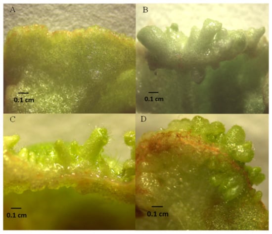 Leaf regeneration test of tobacco plants overexpressing chrysanthemum KNOX genes ((A) shows the edge of wild-type tobacco leaf tissue after 10 days of tissue culture, (B) shows the edge of leaf tissue of tobacco plant overexpressing chrysanthemum CmKNAT1 gene after 10 days of tissue culture, (C) shows the edge of leaf tissue of tobacco plant overexpressing chrysanthemum CmKNAT6 gene after 10 days of tissue culture and (D) shows the edge of leaf tissue of tobacco plant overexpressing chrysanthemum CmSTM gene after 10 days of tissue culture).